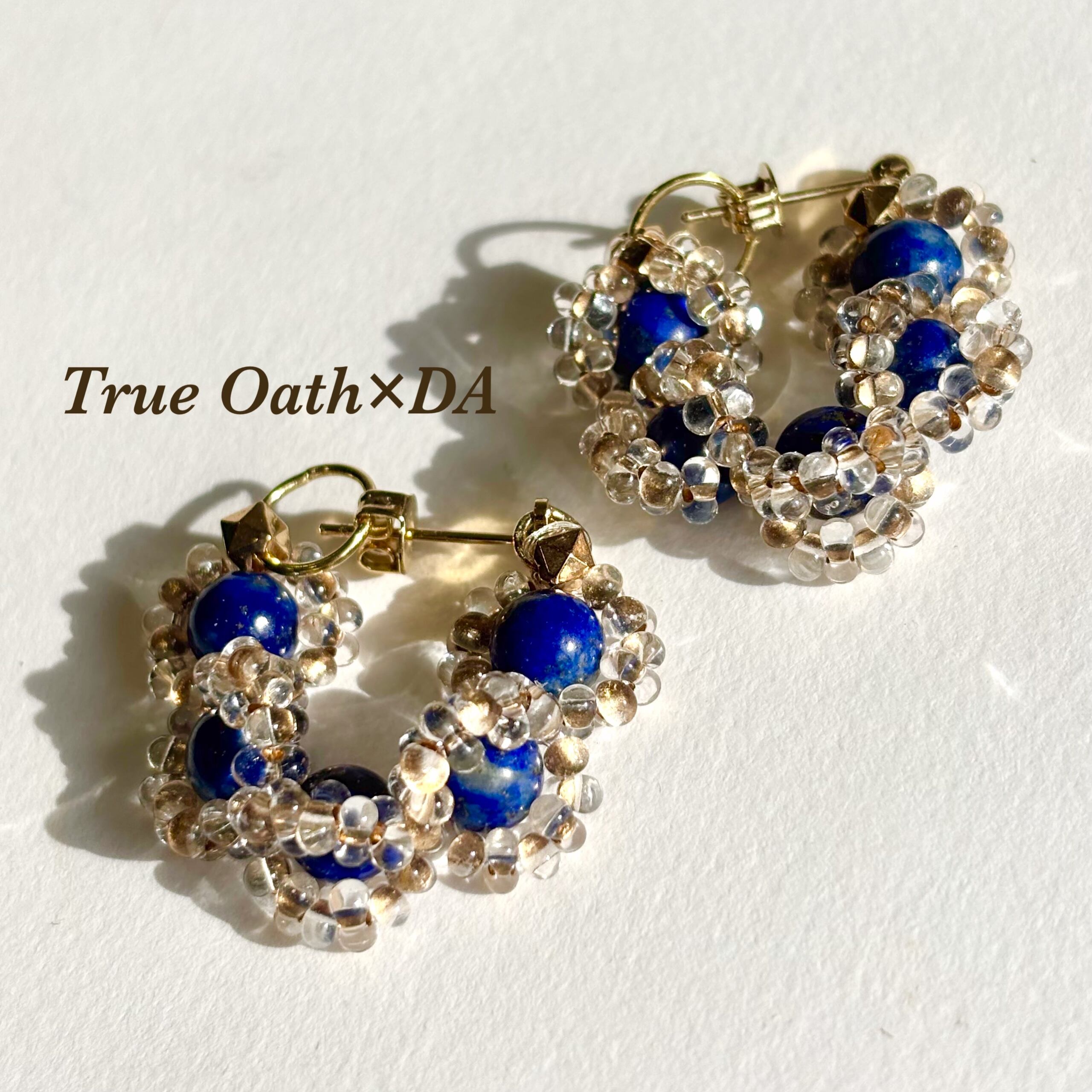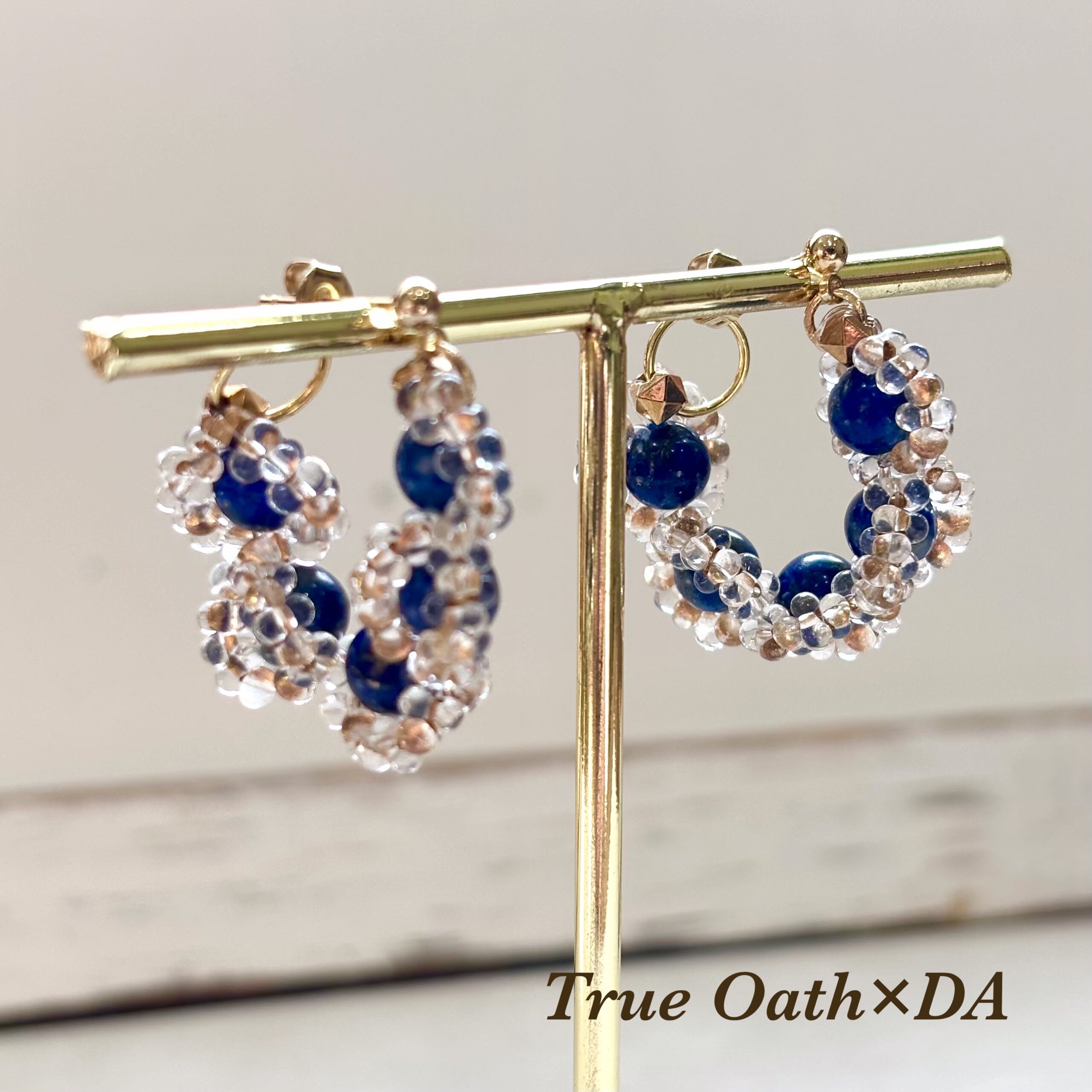 ラピスラズリの美しさを引き立てるようにゴールドのガラスビーズを纏ったピアス