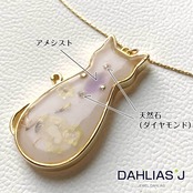 This is a necklace using a gold cat frame, made with dry flowers, an amethyst stone, and diamonds. For the cat lovers who wish to show their love through their accessories, this is the perfect option for you.A purple tint to the overall item gives off a slightly feminie impression, as well as a soft character.